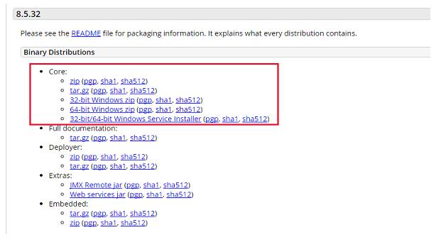 (2)在Tomcat 8下载网页红色线框区域内,Tomcat 8又分成了两个子版本,Tomcat 8.5.32和Tomcat 8.0.53,两个版本可任选其一,选择8.0.53进入8.0.53版本下载页。