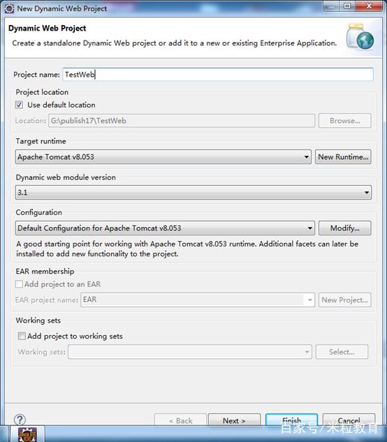 Java Web项目文件存储目录,一般选择eclipse配置的Workspace工作目录,该输入项默认值为eclipse的工作目录+项目文件名称。项目文件存储目录采用默认值即可。