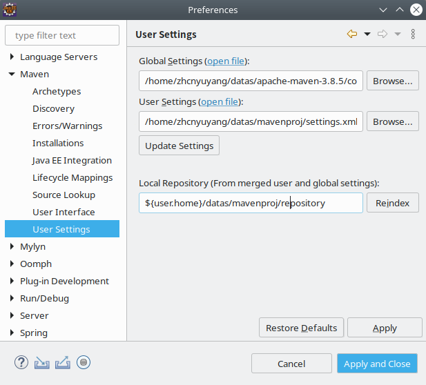 接下来一项是User Settings,这里要填的,是你maven本地仓库中settings.xml的路径。比方说我maven本地仓库是在/home/zhcnyuyang/datas/mavenproj/目录下,那么我User Settings的路径是/home/zhcnyuyang/datas/mavenproj/settings.xml。