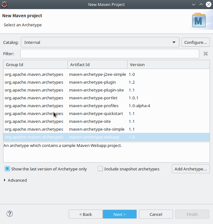 Catalog选择Internal,然后你就可以看到很多选项。由于我们要建立的是web项目,所以我们选择Group Id为org.apache.maven.archetypes,Artifact Id为maven-archetype-webapp的那项,也就是图中所选的那项。之后点击Next,进入下一个页面,如图所示: