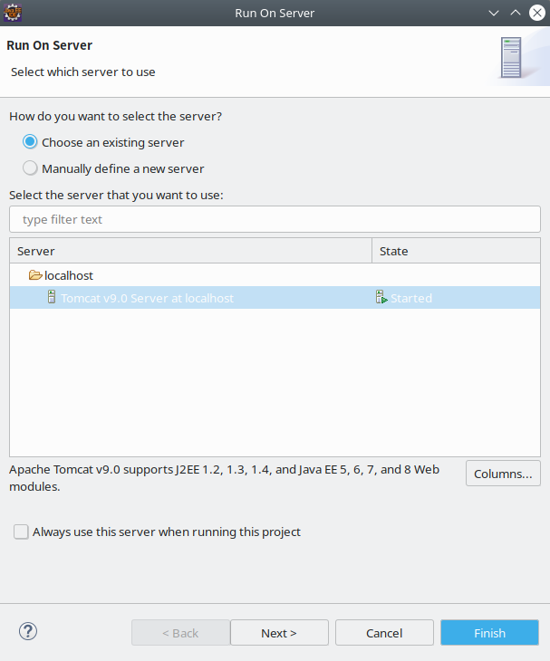 然后执行Run->Run As->Run on Server命令,在弹出的窗口中,选择服务器,如图所示: