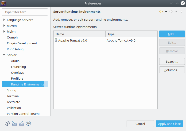 开发jsp的时候,需要用到tomcat。tomcat如何安装,在此我就不再赘述。但安装好Tomcat之后,需要在eclipse中配置好Tomcat路径。在Eclipse中配置tomcat路径也是在Window->Preference下。在左侧的列表中,找到Server->Runtime Environment,如图所示。
