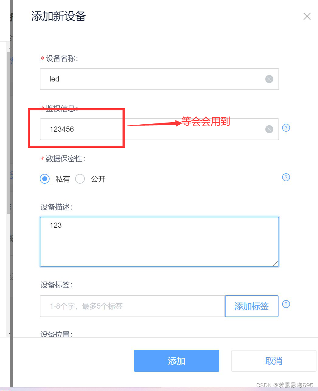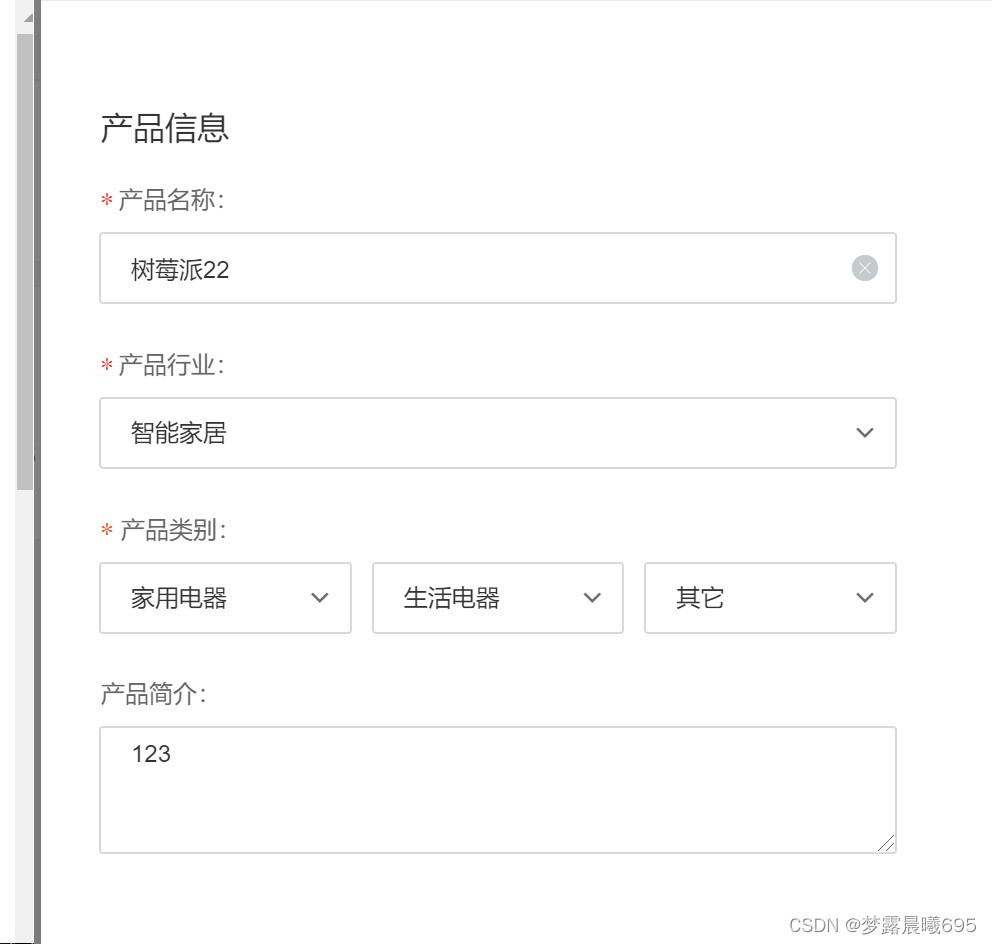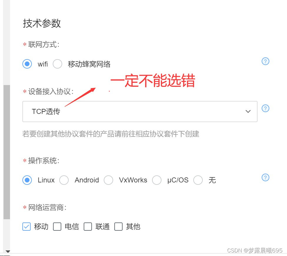 在点击添加产品后,有诸多的信息填入选项(该产品是自己的项目,不算设备,设备在项目生成后会有另外添加)可以依据自己的项目进行填写,也可以随便填,但是联网方式和接入协议不能错写;