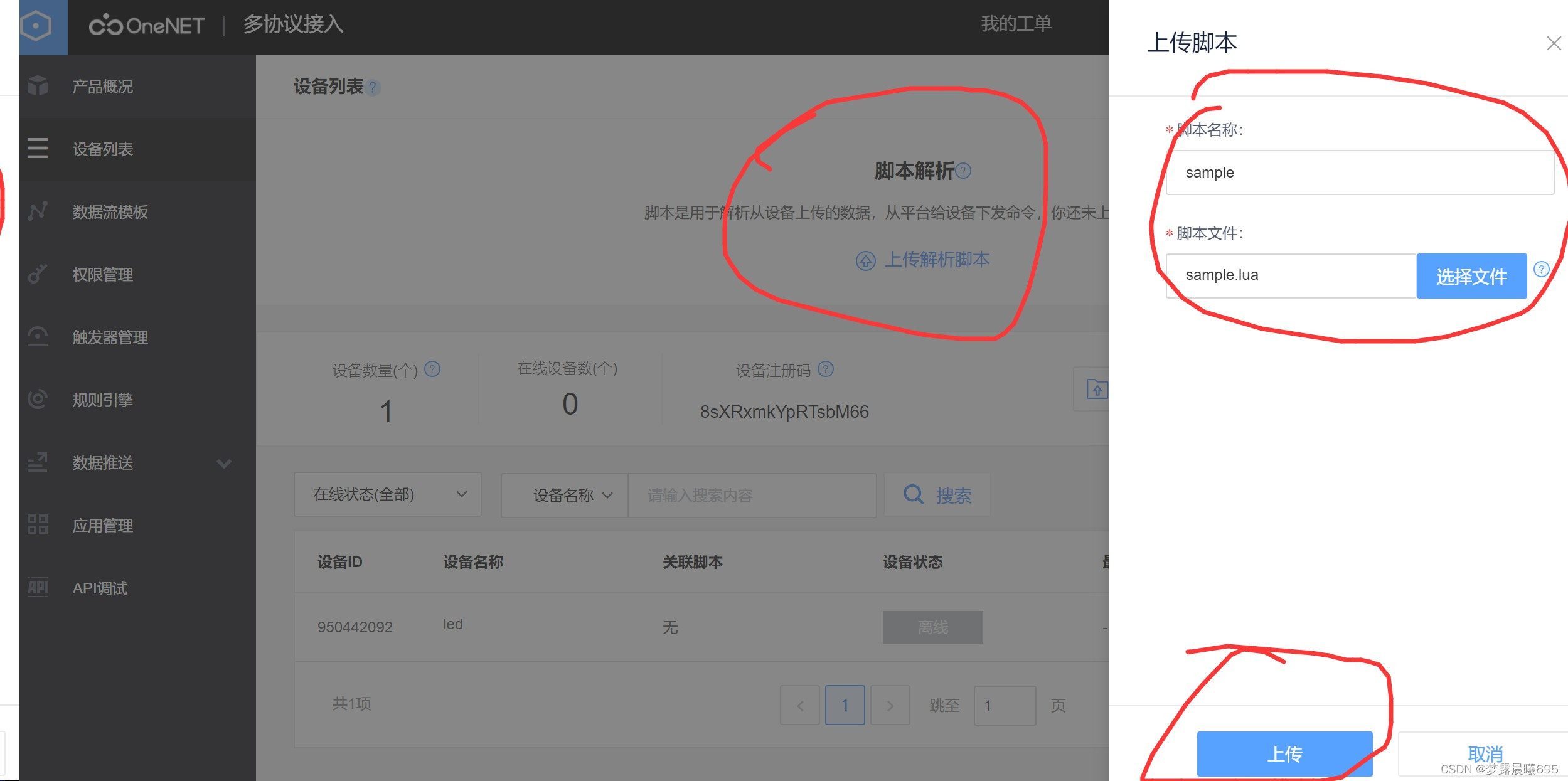 我们点击设备列表,返回到设备信息后,可以看到有个脚本解析,在这边,我们需要上传一个sample.lua的脚本,实现IP地址对OneNet云端的通信。