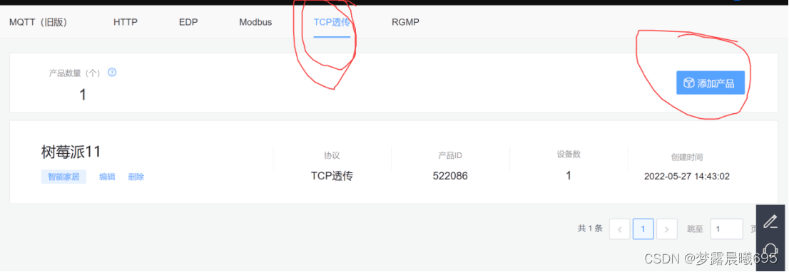 点进去后可以看到有TCP透传这个选项,由于本人在做树莓派开发过程中基本都是TCP/IP进行通信,因此选择该选项,进行产品的添加;