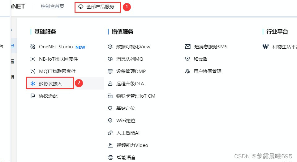 在点进去的界面内,上主菜单有一个全部产品服务,点出来的框内可以看到有多协议接入这个选项