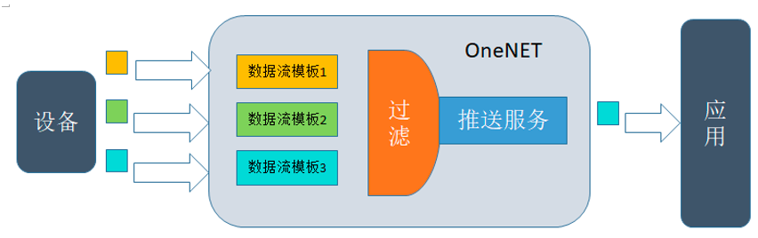 OneNET推送服务提供数据过滤功能,用户可以以数据流模板为过滤条件,过滤掉例如设备的频繁的周期性上报等大量时间不敏感数据,只推送用户自己关心的实时性要求较高的数据,如下图所示。