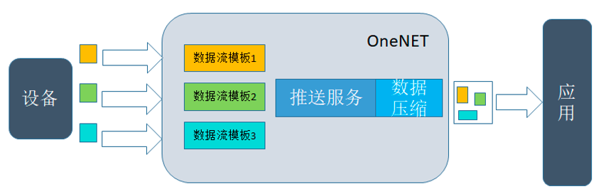 当然,OneNET推送服务提供数据压缩的功能,用户可以设置数据量以及时间的压缩方式,将一定时间内的一定量的多包单信息报文,合并成为一包包含多条信息的json数据,可以大大减少应用服务器的处理压力,如下图所示