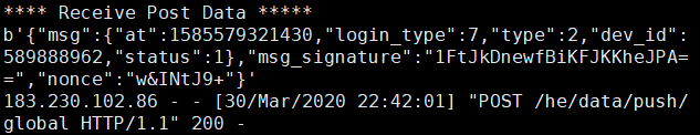 OneNET平台以HTTP POST请求形式向第三方平台URL地址推送数据,第三方平台接收到数据后需要返回 HTTP 200,否则OneNET会认为此次推送无效并重试。