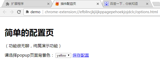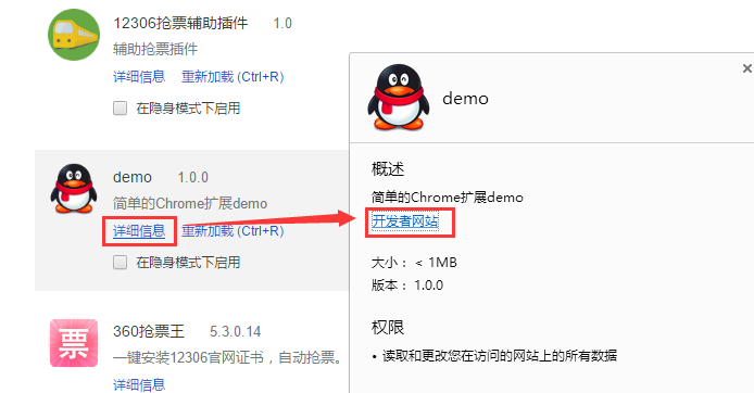 full-chrome-plugin-demo:大部分demo代码都在这个仓库;simple-chrome-plugin-demo:最精简的Chrome仓库模板,当需要快速写一个简单仓库时可以基于这个模板;page-action-demo:关于page-action部分的demo代码,由于这部分代码和full-chrome-plugin-demo冲突,所以单独拿出来;