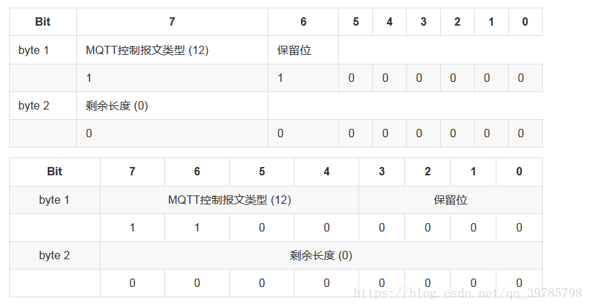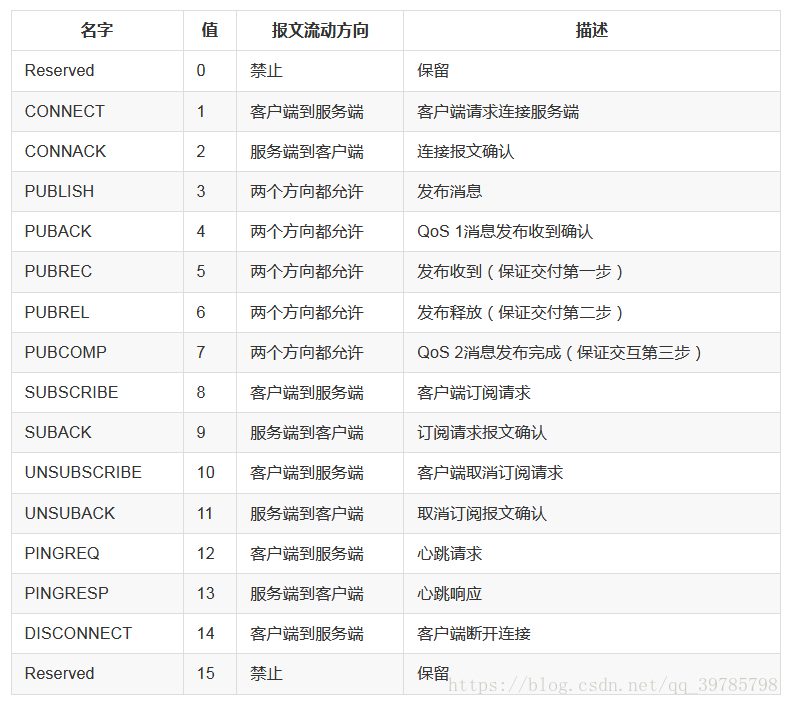 #define MQTT_TypeCONNECT 1//请求连接 #define MQTT_TypeCONNACK 2//请求应答 #define MQTT_TypePUBLISH 3//发布消息 #define MQTT_TypePUBACK 4//发布应答 #define MQTT_TypePUBREC 5//发布已接收,保证传递1 #define MQTT_TypePUBREL 6//发布释放,保证传递2 #define MQTT_TypePUBCOMP 7//发布完成,保证传递3 #define MQTT_TypeSUBSCRIBE 8//订阅请求 #define MQTT_TypeSUBACK 9//订阅应答 #define MQTT_TypeUNSUBSCRIBE 10//取消订阅 #define MQTT_TypeUNSUBACK 11//取消订阅应答 #define MQTT_TypePINGREQ 12//ping请求 #define MQTT_TypePINGRESP 13//ping响应 #define MQTT_TypeDISCONNECT 14//断开连接 unsigned char GetDataFixedHead(unsigned char MesType,unsigned char DupFlag,unsigned char QosLevel,unsigned char Retain) { unsigned char dat = 0; dat = (MesType & 0x0f) << 4; dat |= (DupFlag & 0x01) << 3; dat |= (QosLevel & 0x03) << 1; dat |= (Retain & 0x01); return dat; }