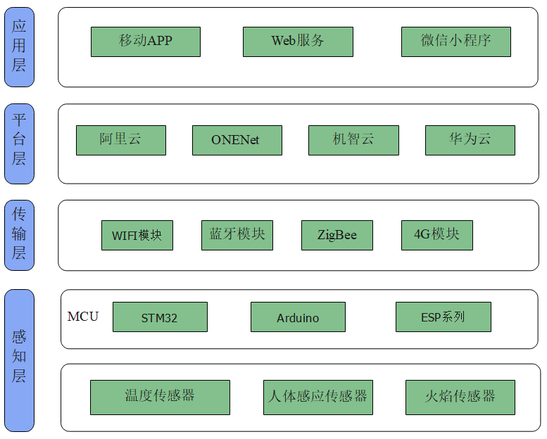 物理层通常由MCU、感知节点、执行节点构成。MCU相当于大脑,负责与各个节点交互,MCU可以是STM32、Arduino、ESP8266、ESP32、51单片机等控制器。感知节点及一些传感器,用于获取需要的数据,感知节点根据需求来确定。执行节点一般来说是继电器、风扇等设备。