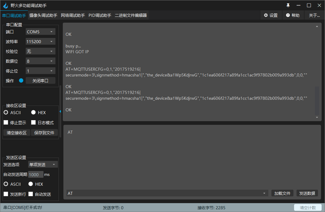 启动SpringBoot项目,打开开发板,测试是否连通,连通效果成功,控制台收到物理层数据如图5.10,使用web发送数据串口打印如图5.11所示。