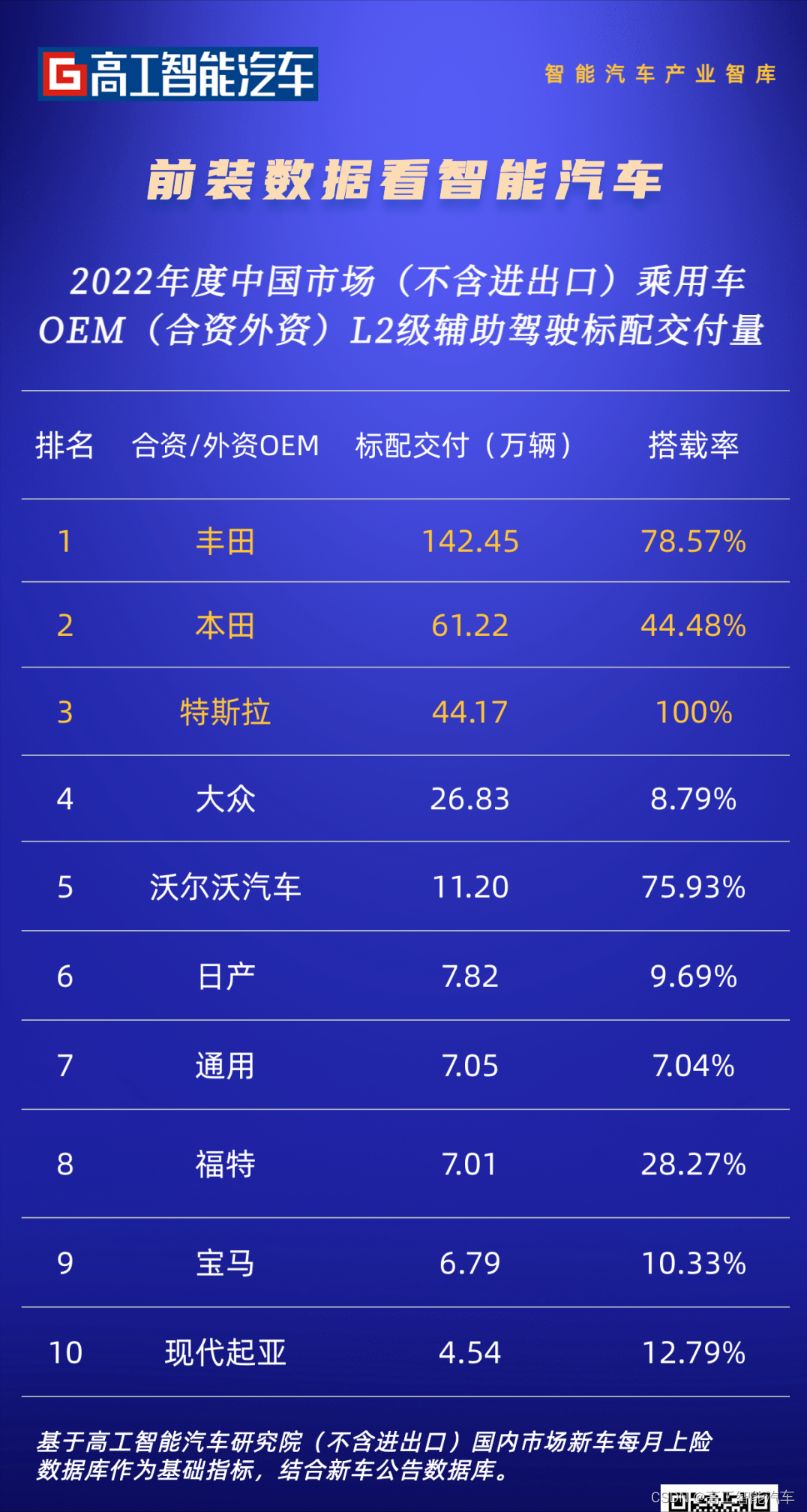 品牌方面,丰田、本田、特斯拉位居2022年合/外资车企L2级辅助驾驶交付量前三位,在前十交付规模的车企中,大众、日产、通用、宝马、现代起亚的搭载率低于市场平均水平。