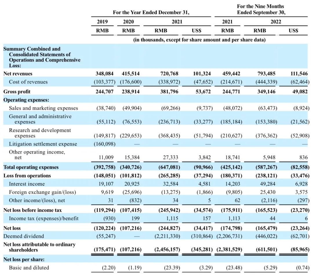毛利率方面,2022年前三季度继续下滑,从上年同期的53.3%下降至44.0%,净亏损则有所收窄,为1.655亿元(上年同期为1.748亿元)。