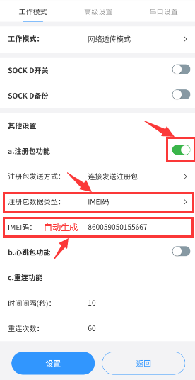 勾选注册包功能,注册包数据类型选择IMEI码,将会自动生成一个IMEI码。