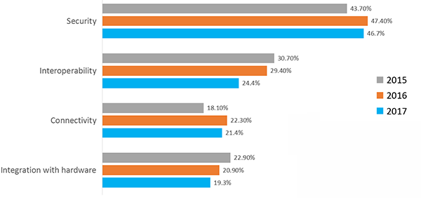 安全问题仍是众多 IoT 开发者关注的重点,占比高达 46.7%。接而协同性(24.4%)和连接性(21.4%)位居其次。但从下图中,我们也发现相比 2015 年的协同性(30.7%)和 2016 的协同性(29.4%)而言,今年开发者对这方面关注似乎呈下降趋势,同时这表明行业的标准和物联网中间件起到了一定作用。