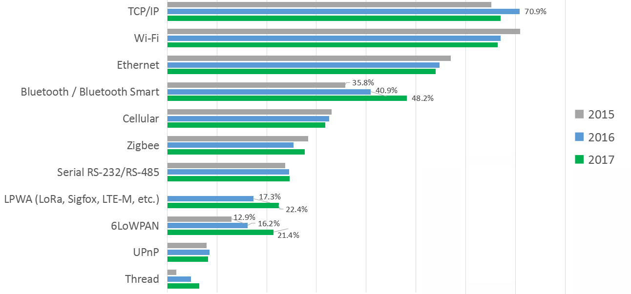 对于过去的三年中,TCP/IP 和 Wi-Fi 一直是开发者最受欢迎的连接协议。然而,更多的连接协议及技术出现,基于 2017 年的数据,物联网开发者社区采用了蓝牙/智能蓝牙(48.2%)、LPWAN技术(LoRa、Sigfox、LTE-M)(22.4%)和 6LoWPAN(21.4%)。不过,Thread(6.4%)的使用率仍然较低。