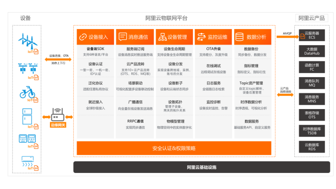 设备连接物联网平台,与物联网平台进行数据通信。物联网平台可将设备数据流转到其他阿里云产品中进行存储和处理。这是构建物联网应用的基础。