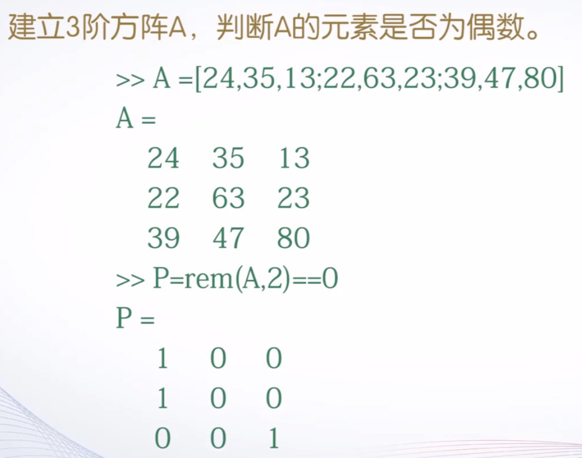(3)当参与比较的是标量和矩阵时,则把矩阵的每一个元素按标量关系运算规则逐个比较,最终的关系运算的结果是一个与原矩阵同型的矩阵,由0或1构成
