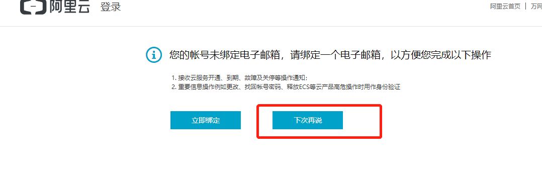 1.1.4 输入完账号,登记登录后,提示绑定有限,可以绑定或不绑定,选择下次再说