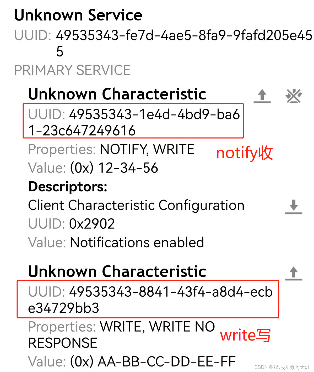 该型号默认使用的write和notify的uuid通道分别是:以e34729bb3结尾是write信道,以4bd9-ba61-23c647249616结尾的是接收信道。