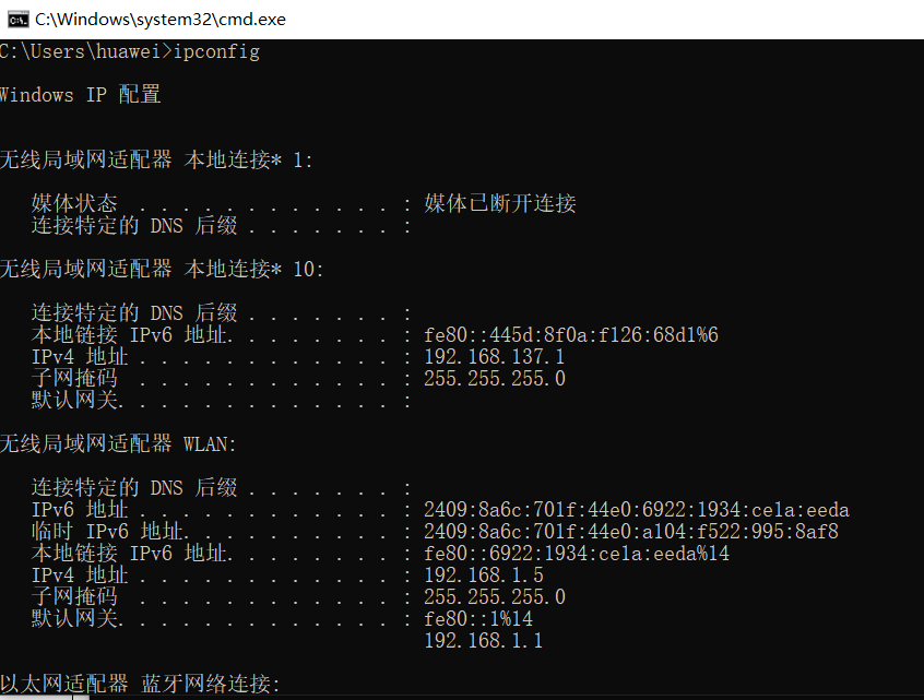 - win+r 调出命令面板 然后输入 ipconfig 就可以查看电脑此时的局域网ip地址