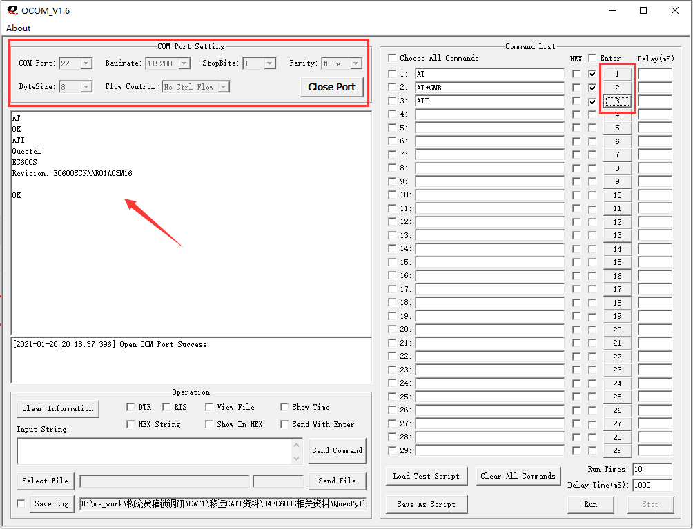 - 按照左上角配置,打开 Quectel USB AT Port 所在的端口。右侧发送 "AT" "ATI" 指令,如果能在左侧窗口看到指令发送成功,并且有信息回复,则 USB驱动安装成功。