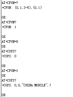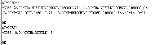 返回当前选择的网络运营商信息。(AT+COPS=?的响应很久,最大返回时间为180s)