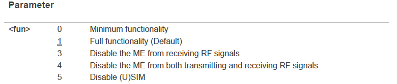 AT+CFUN=?:查询模块支持的功能模式列表。