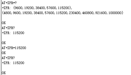 AT+IPR=?:列表设备UART端口支持的波特率。