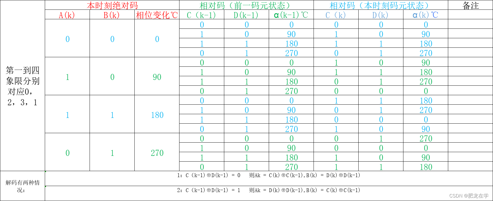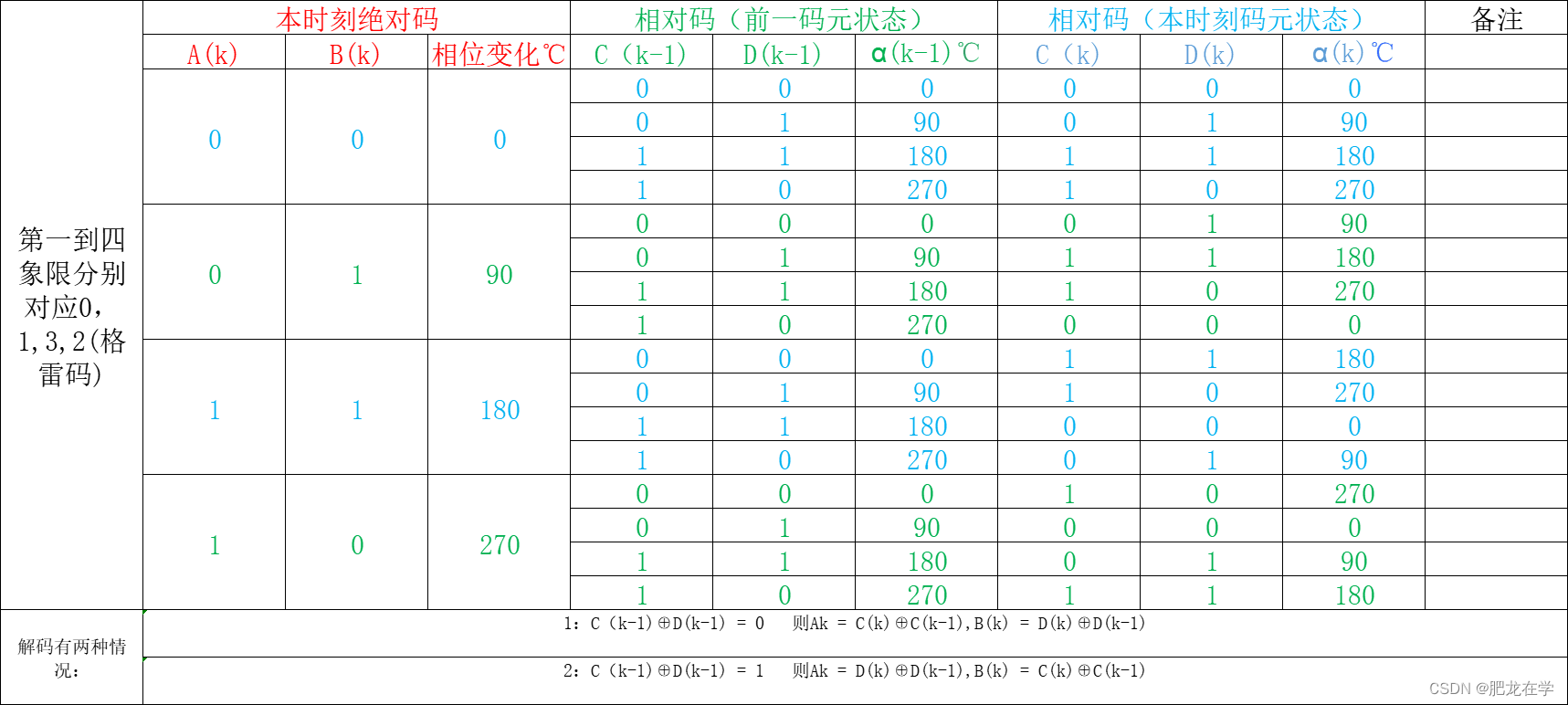 现如今绝大多数映射关系都采用格雷码的方式,即1~4象限分别对应于0132,0231或1023等等,每次相位变化90°只有一位码元发生改变;对于格雷码类映射关系,直接上图:
