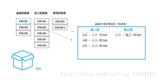 - 发起交易的时候,发起人会收到一张小纸条,他需要将交易记录比如说“盗盗转账给张三 40 元”写在纸上。说来也神奇,当写完的那一刹那,在小纸条的背面会自动将这段交易记录格式化成至少包含了“输入值”和“输出值”这两个重要字段;“输入值”用于记录数字货币的有效来源,“输出值”记录着数字货币发往的对象。