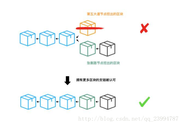 就上图而言,所有基于张衡路节点挖矿获得的区块以及后续区块的那条分支被视为有价值,最终会全部保留了下来;其他节点会统一效仿那个拥有更长分支链的节点所做的决策。另外,值得一提的是,同一时间,较短分支上的区块会立即丢弃,而里面的小纸条也会随之释放出来,被重新标记上“未确认”。