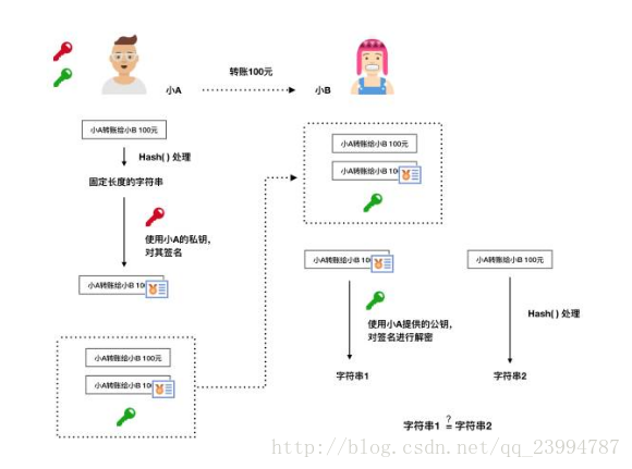 - 第四步:当小 B 收这三样东西,首先会将明文的小纸条进行 Hash()处理,得到一个字符串,我们将其命名为“字符串 1”。然后,小 B 使用小 A 公布的公钥,对发过来的数字签名进行解密,得到另外一个“字符串 2”。通过比对“字符串 1”和“字符串 2”的一致性,便可充分证明:小 B 接受到的小纸条就是小 A 发出来的小纸条,这张小纸条在中途没有被其他人所篡改;且这张小纸条确实是由小 A 所编辑。