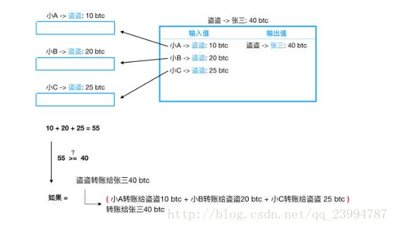 就上图的例子,我们追溯到曾经转账给盗盗的有效交易记录有“小 A 转账给盗盗 10 btc”、“小 B 转账给盗盗 20 btc”、“小 C 转账给盗盗 25 btc”,我们需要将这三条交易记录合并成一条更复杂描述的交易记录,即 “( 小 A 转账给盗盗 10 btc + 小 B 转账给盗盗 20 btc + 小 C 转账给盗盗 25 btc ) 转账给张三 40 btc ”