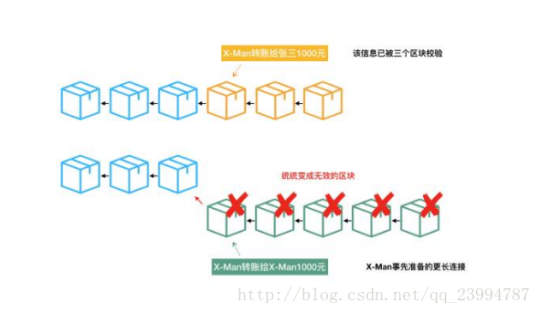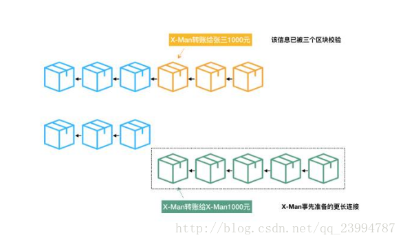 - 首先,X-Man 事先创造了一条独立的(不去广而告之)、含有比较多区块的链条。其中一个区块里放着“X-Man 转账给 X-Man 1000 元”的纸条。