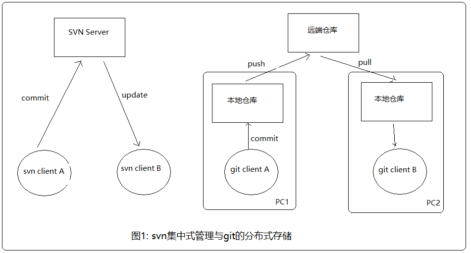 svn是一个集中式的服务器,代码版本变更信息都存储在svn server服务端,每个客户端磁盘里只有众多版本中的其中一个版本,假如服务端坏掉了,那我们就丢失了版本变更记录。