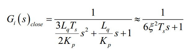 第二个:电流内环的等效传递函数。一般在研究外环时,将内环闭环传函视作一阶惯性环节。具体推导如下图所示,一般按照阻尼比等于0.707设计电流内环,所以此时电流内环的传递函数为 1/3Ts*s+1。有同学这里就问了,电流环的输入是iq输出不应该是Uq么,怎么到了这里既没有输入标识也没有输出标识呢,其实这里对于电流内环的近似纯粹只是考虑其在控制时间上带来的延迟效果,所以没有输入和输出,仅仅作为一阶惯性环节来定义。