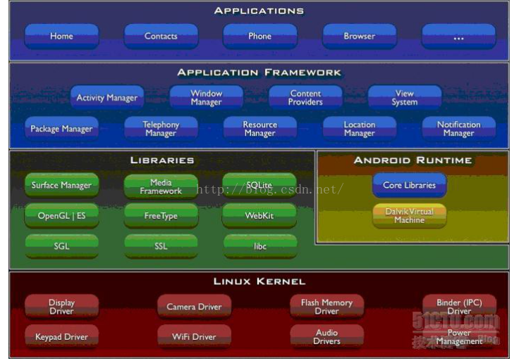 从Android框架看,分为四层:应用层、应用框架层、库层、内核层。
