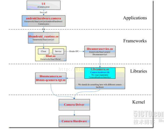 e. 为了实现一个具体功能的Camera,在最底层还需要一个硬件相关的Camere 驱动库(例如通过调用video for linux 驱动程序和Jpeg 编码程序实现)。这个库将被Camera 的服务库libcameraservice.so 调用。
