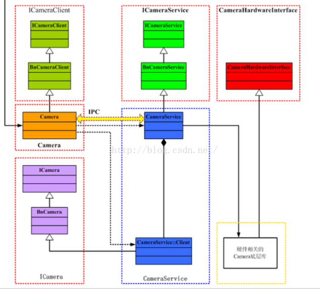 这部分内容被编译成库libcameraservice.so 。CameraService 是Camera 服务,Camera 框架的中间层,用于链接CameraHardwareInterface 和Client部分 ,它通过调用实际的Camera 硬件接口来实现功能,即下层HAL层。