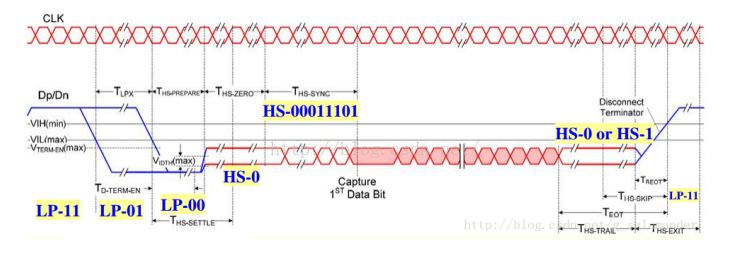 控制模式:LP11,LP10,LP01,LP00四个状态;MIPI协议规定控制模式4个不同状态组成的不同时序代表着将要进入或者退出高速模式等;比如LP11-LP01-LP00序列后,进入高速模式。下图为线上电平的图示