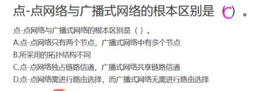 A:点对点网络(如广域网)节点之间都是点对点连接的,两个节点可通过交换机建立物理线路(有线或无线)连接,并不限制节点数目,广播式也不限制。此选项是混淆视听。