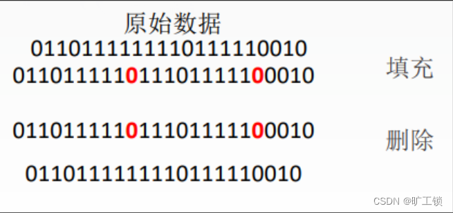 接收端对帧中的比特流进行扫描。每当发现 5 个连续1时,就把这 5 个连续 1 后的一个 0 删除。