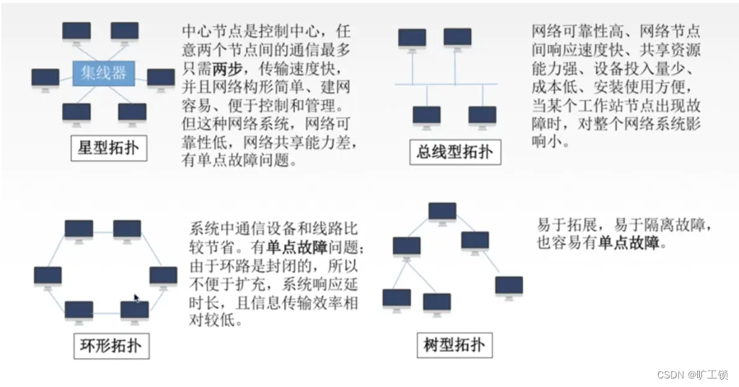 拓扑结构:计算机,电缆,网络上其他组件的安排方式和物理布局