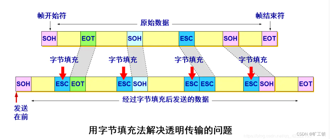 - 发送端的数据链路层在数据种控制字符SOH和EOT前插入一个转义字符ESC(十六进制表示1B,二进制为00011011)