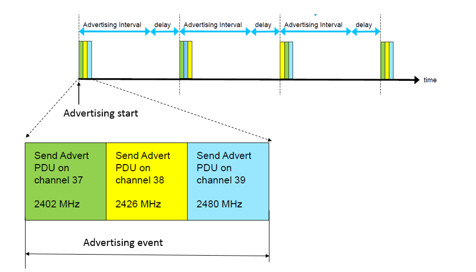 以一定的时间间隔广播数据,这个间隔称为称为advertising interval,为了改善设备的兼容性,在两个广播时间间隔之间,还有加上一个随机的0-10ms的delay时间。