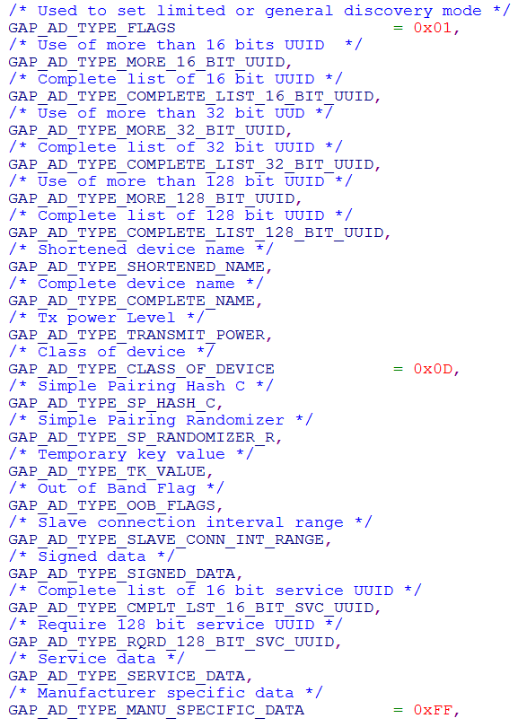 AD type定义在Core Specification Supplement(CSS) v7 https://www.bluetooth.com/specifications/adopted-specifications