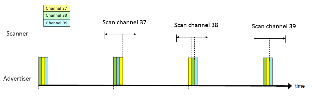 advertiser 和 scanner之间不存在任何同步方式,只有广播和扫描所在的通道随机重合时,双方才能发现。